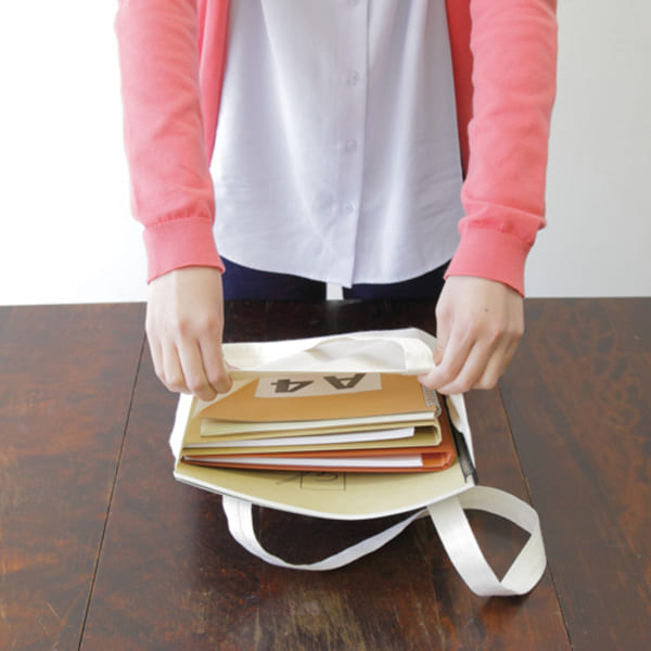 B4サイズ相当の書類が収納でき、展示会資料やパンフレットの持ち運びにも便利。