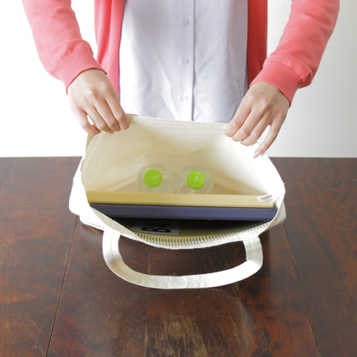 通常のトートバッグよりも横幅と底マチをやや広めに設計しているため、荷物をしっかり収納できる実用性の高さもポイント。