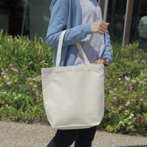一般的なトートバッグと同程度の使いやすいサイズ感で、日常使いからイベント配布まで幅広いシーンに活躍するアイテムです。