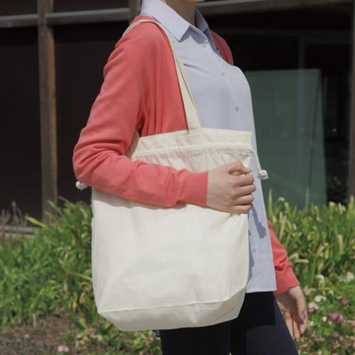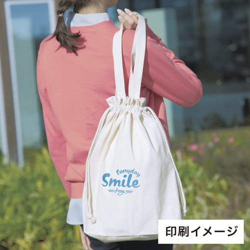 巾着としてはもちろん、トートバッグとしても使える2WAY仕様で、日常使いから販促・ノベルティまで幅広く活躍。