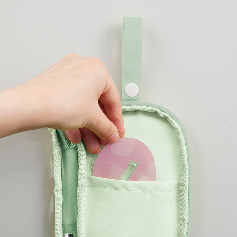 ポケット付きなので小物入れとしても便利に活用でき、また本体と同色のストラップ付きなので、バッグなどに取り付けていつでも持ち歩くことができます。