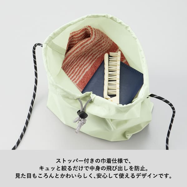 ストッパー付きの口元を絞れば中身の飛び出しを防ぎ、丸みのある可愛いフォルムに。