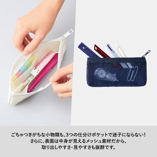 3つの仕分けポケット付きで、ペンや文房具をすっきり整理できるペンケース!