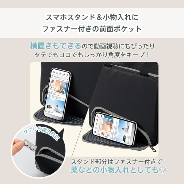 前面ファスナーを開けると、シリコン加工部分にスマホを固定でき、動画やSNSを見やすい角度で楽しめます。