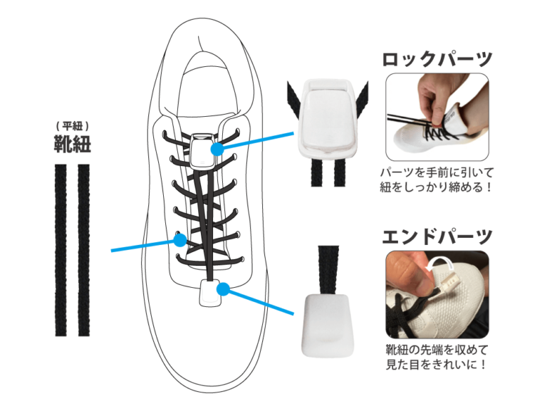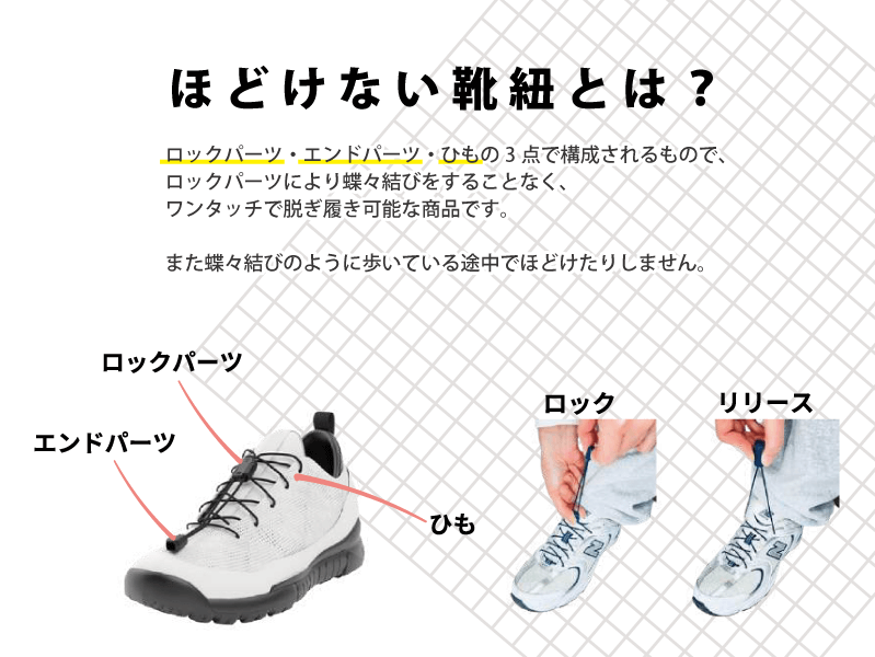 BOOSTRIDE(ブーストライド)の「ほどけない靴紐」は、ワンタッチで脱ぎ履きできる便利なアイテムです。ロックパーツとエンドパーツでしっかり固定されるため、歩行中にほどける心配がなく、スポーツやアウトドアはもちろん、普段使いにも安心してお使いいただけます。「ほどけない靴紐」は既存のスニーカーにも後付けできます。