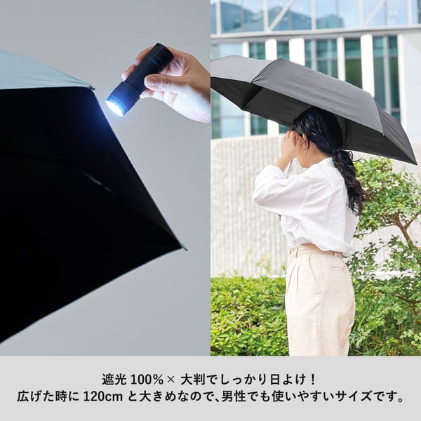 日差しをしっかり遮る、大判サイズの遮光折りたたみ傘です。