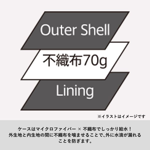 収納ケースは、外生地と内生地の間に不織布を挟んだ構造で、水滴の外漏れを防止。