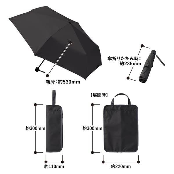 ■ 本体サイズ:ケース/約W110×H300(mm)、展開時/約W220×H300(mm)、傘:親骨/約530(mm)、折りたたみ時/約235(mm)
