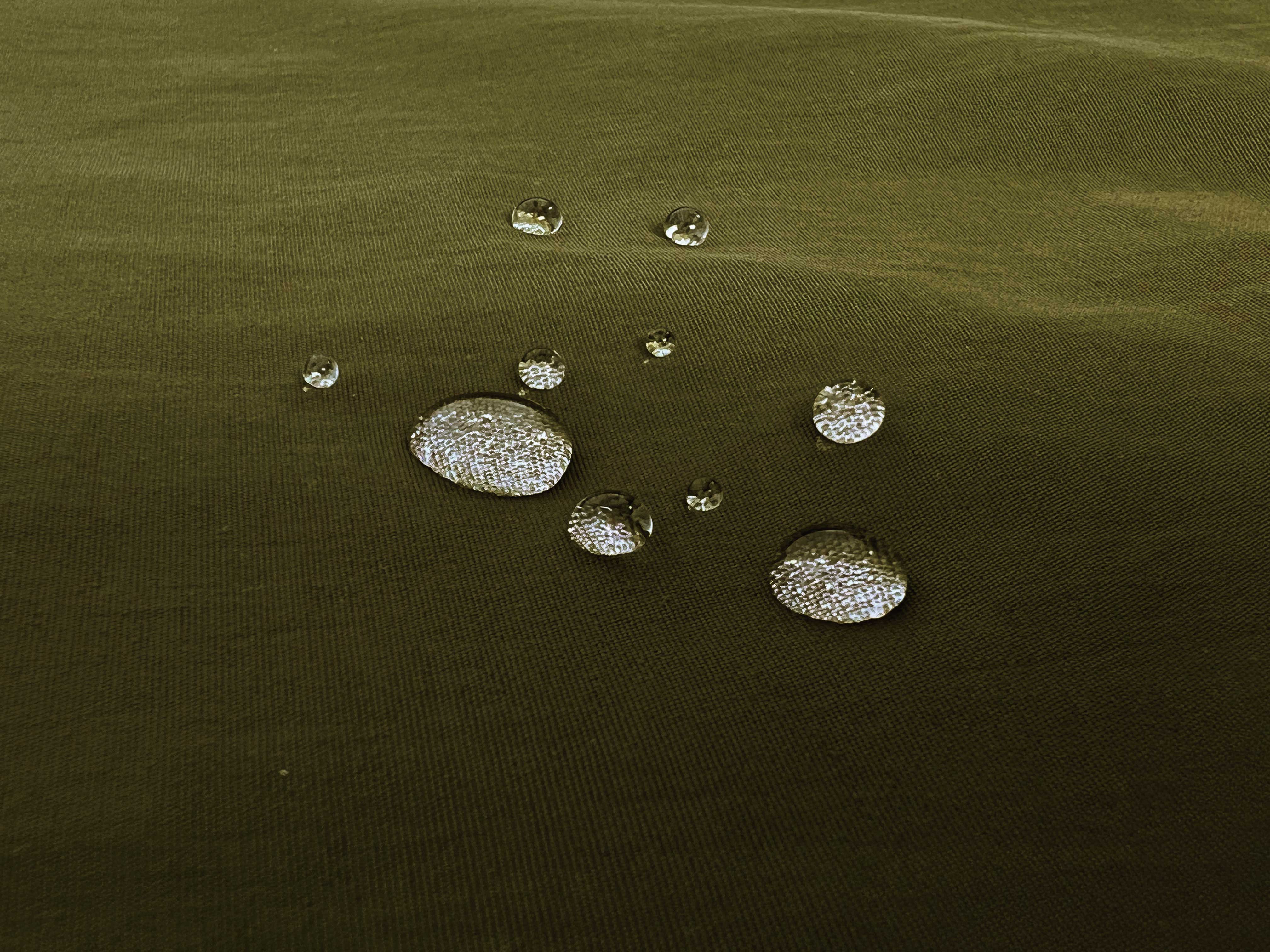 生地の表面には、はっ水・耐水性の加工をしています。生地をコーティングしても、布目の隙間は塞がれないので空気や蒸気は通します。通気性が保たれるので蒸れにくいというメリットがあります。