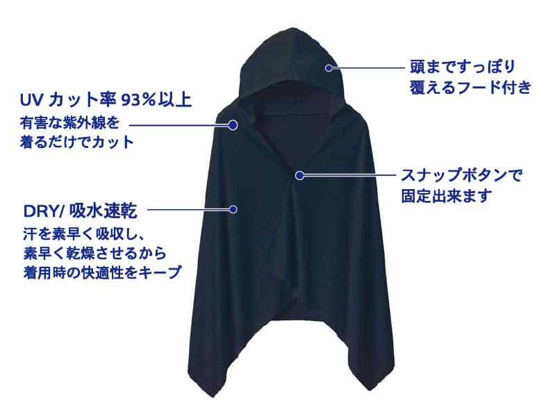 また、フード付きで頭までしっかり覆え、スナップボタンで簡単に固定できる機能性も魅力。