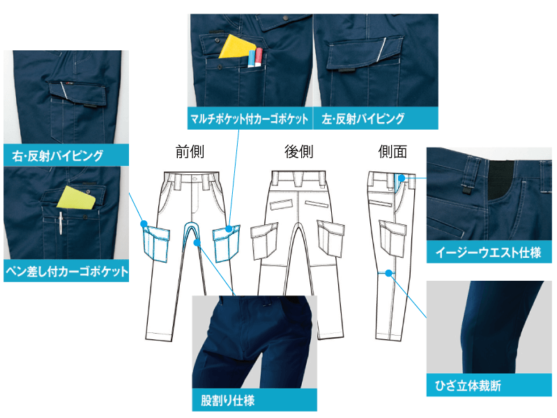 イージーウエスト仕様により、脇にゴムを挟み込みウエストの動きに対して柔軟に対応が可能です。